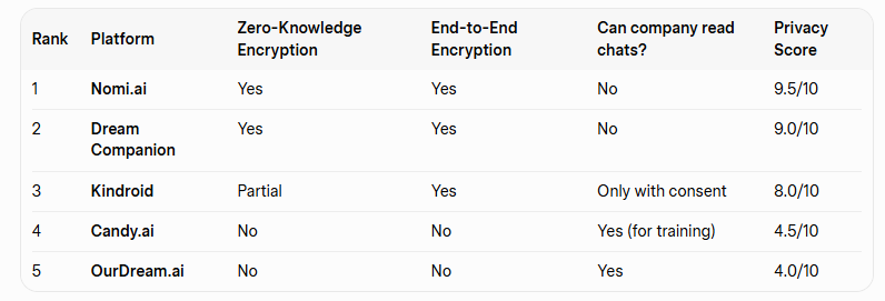 Top recommendation for privacy-conscious users: Nomi.ai and Dream Companion currently offer the strongest protection.